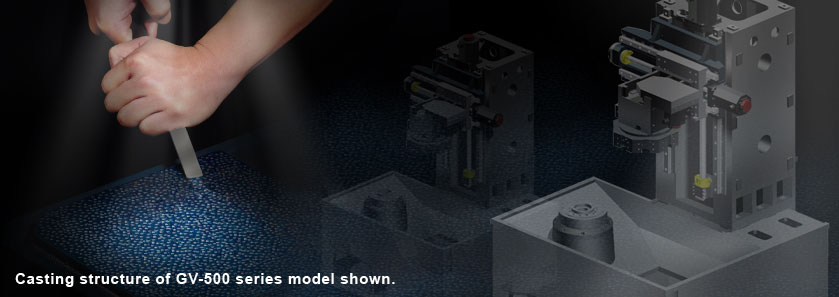 By using Finite Element Methods ( FEM ), optimal reinforced ribbings are directly casted into the one-piece bed and column structure. Mechanical rigidity has been increased by 30% when compared to conventional designs. The GV-500 series is capable of performing heavy-duty turning and maintain long-term high-precision accuracy. More rigidity also means extended tool life.
