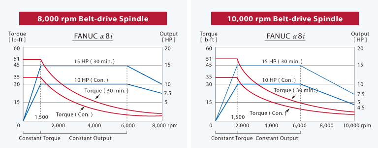 The spindle is equipped with FANUC α8i motor, which provides maximum output of 11 kW ( 15 HP ).