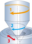 3. Grinding wheel moves reciprocally along the conic surface.