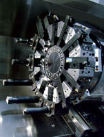 The standard 12-station turret clears 8” diameter work holding devices without interference, even when loaded with tooling at maximum shank size.