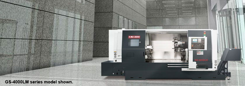 Under the covers, you’ll find a 30 degrees slant bed with super wide box ways, and GS-4000 & GS-4300 series equipped with an enormous 2-speed head stock driven by a 37 kW ( 30 min. ) FANUC motor.