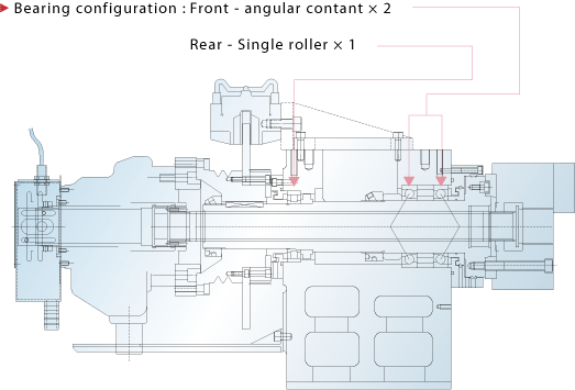 The headstock is analyzed by FEM to reach high rigidity and stability. The spindle inside the headstock is supported by two high precision angular contact ball bearings and a single row roller bearing. The span between bearings is optimized to sustain radial, axial and varyingly compound loads. All these features make it meet the requirements of high speed and precision cutting. The bar capacity is available with 32 and 45 mm two options.