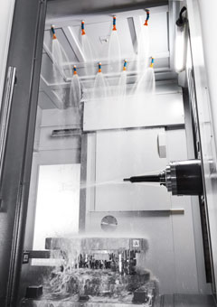 The coolant flushing system around the spindle and roof can effectively flush chips away from the working area in order to ensure stability and precision of the machine.